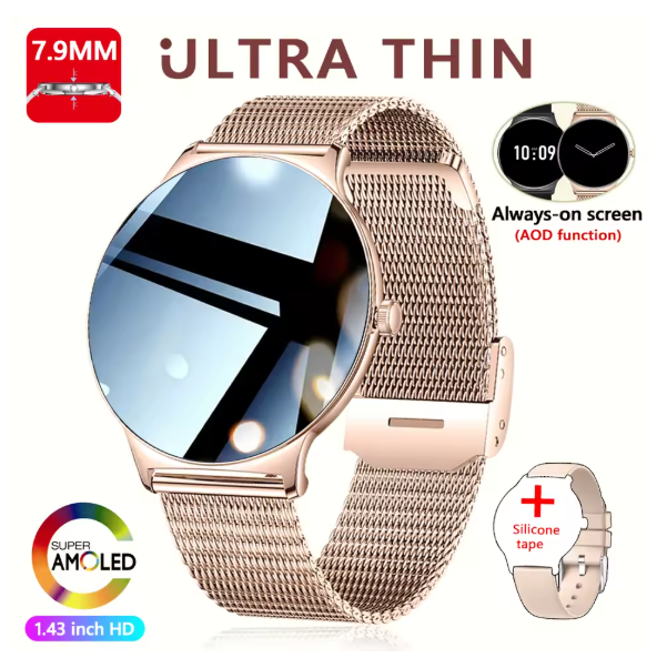 Smart Watch for women with AMOLED always-on display, Bluetooth calling, and sports tracking. Stylish, ultra-thin design for daily use.