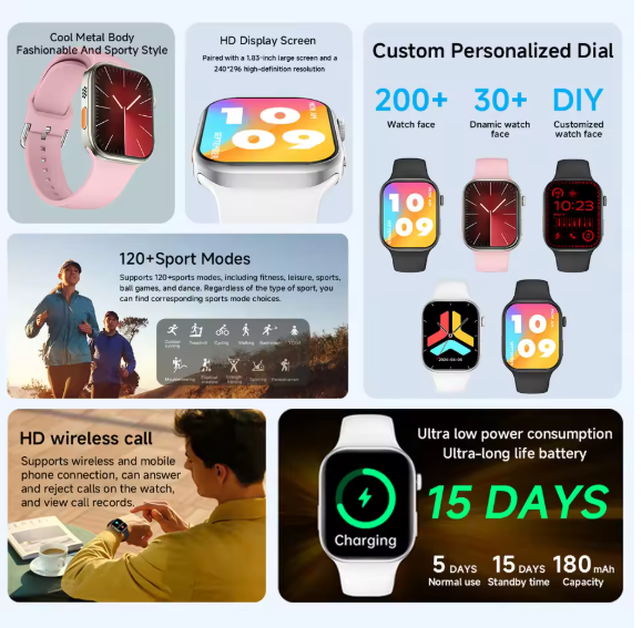 Featuring a large 1.83-inch high-resolution screen, the Smartwatch offers clear visuals and smooth touch control for easy navigation. The bright display makes it simple to view notifications, health data, and fitness information at a glance, even during daily activities or workouts.